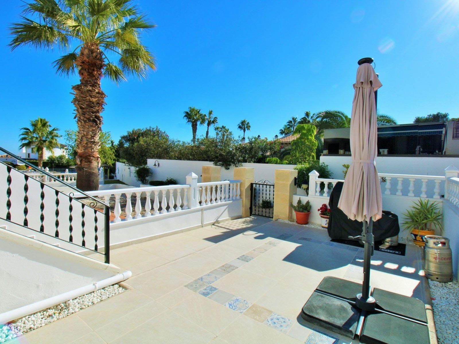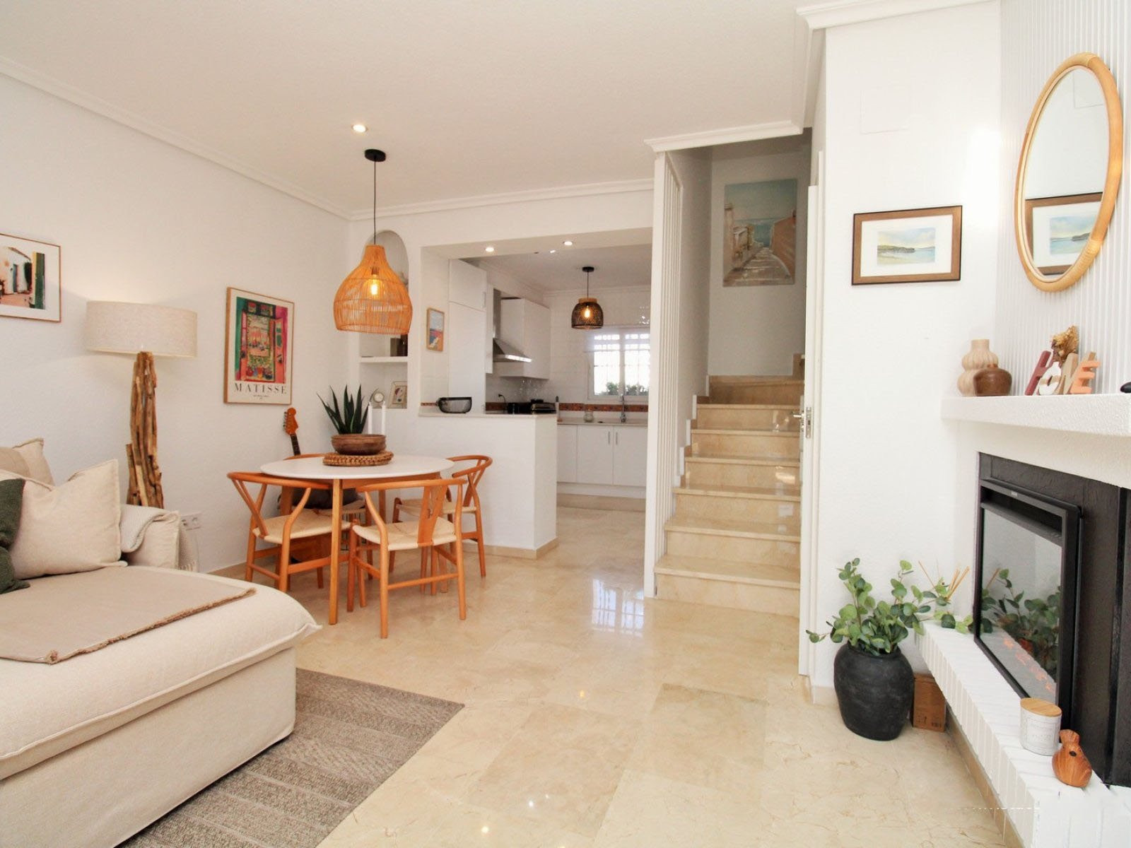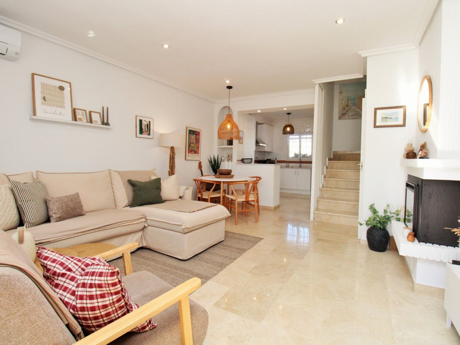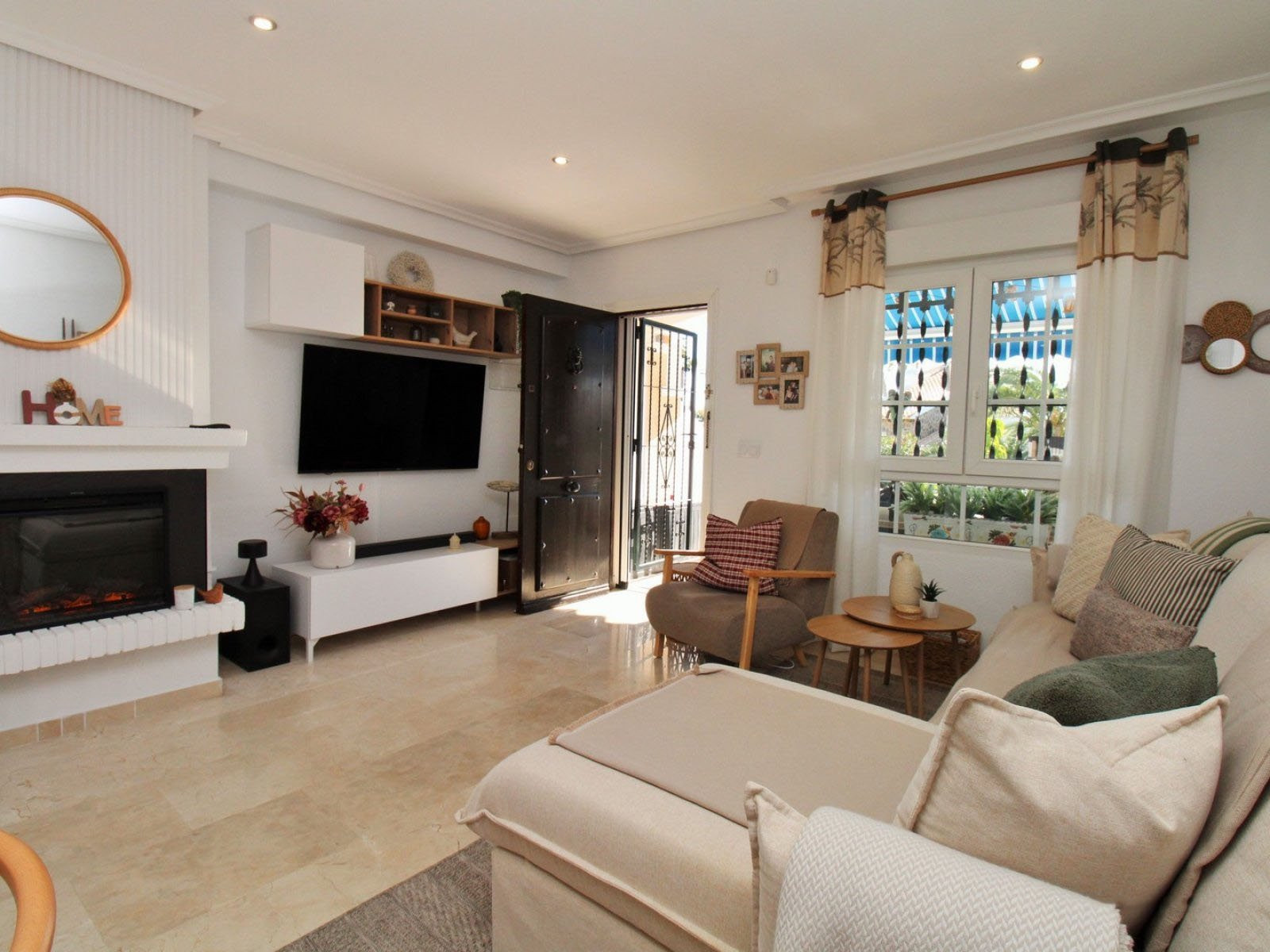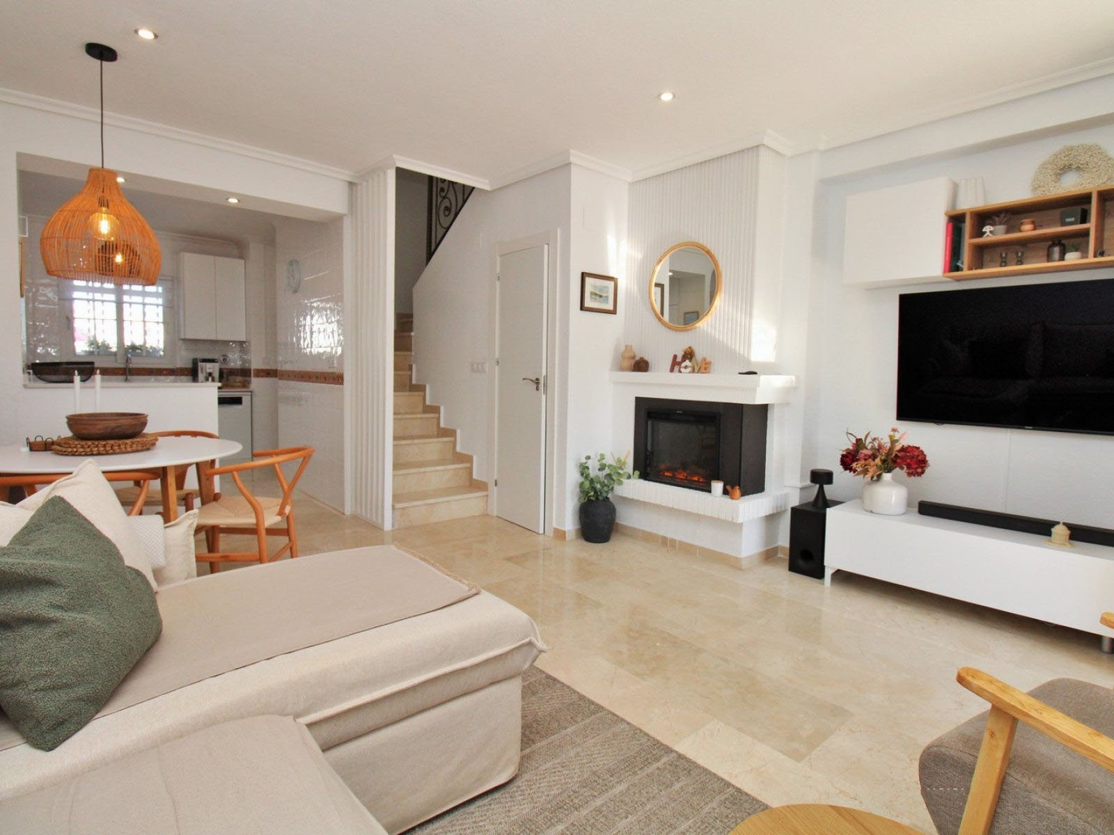 Inuti har bottenvåningen ett ljust och rymligt vardagsrum/matsal med en öppen spis, ett helt renoverat modernt kök med tvättstuga och en gästtoalett. Både fram- och bakträdgårdarna har nyligen kaklats om, och den upphöjda terrassen – komplett med utfällbara markiser – har utsikt över poolområdet.