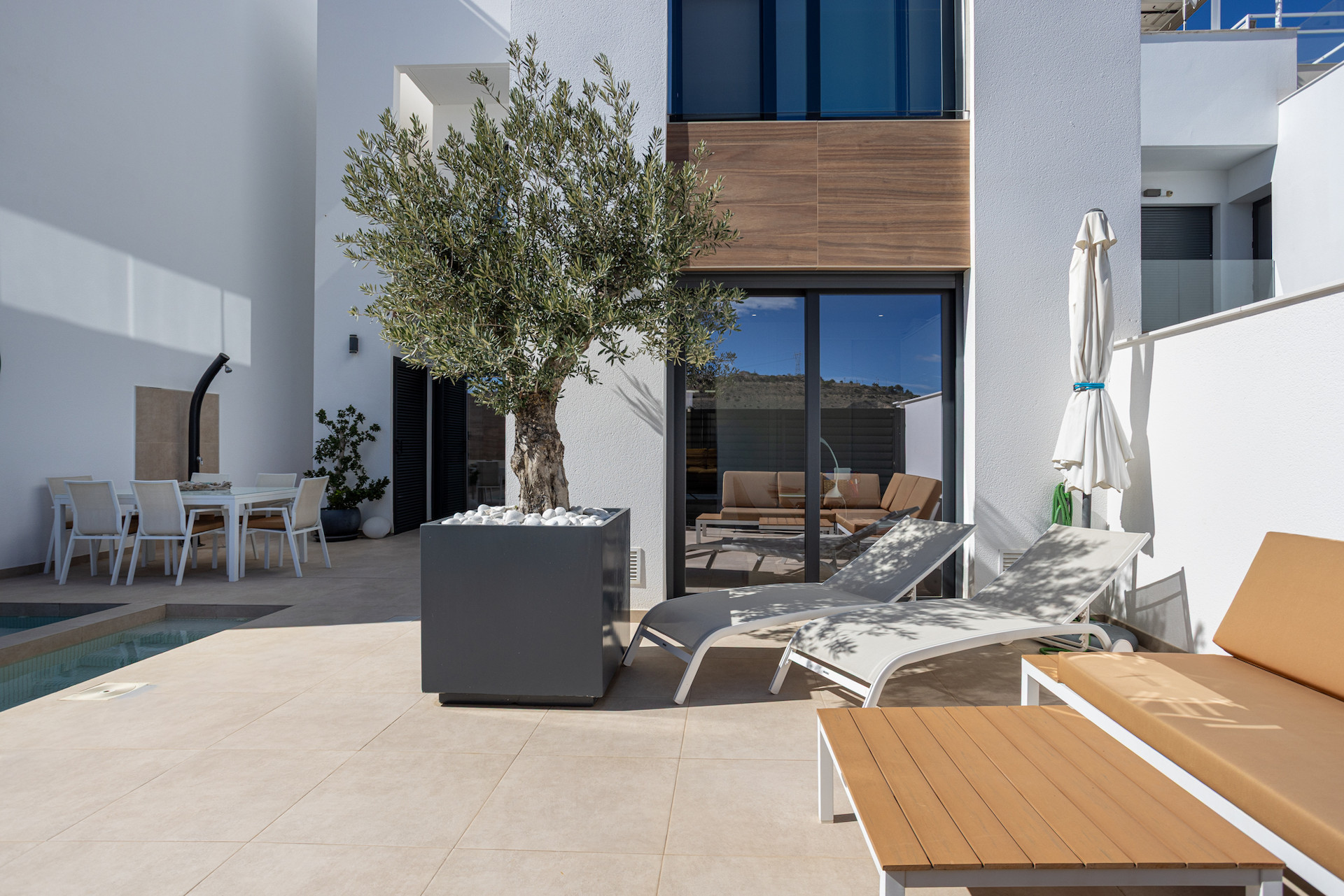 Modern och funktionell design med ett ljust vardagsrum, fullt utrustat kök och direkt tillgång till terrassen och den privata poolen – uppvärmd med värmepump för njutning året runt.