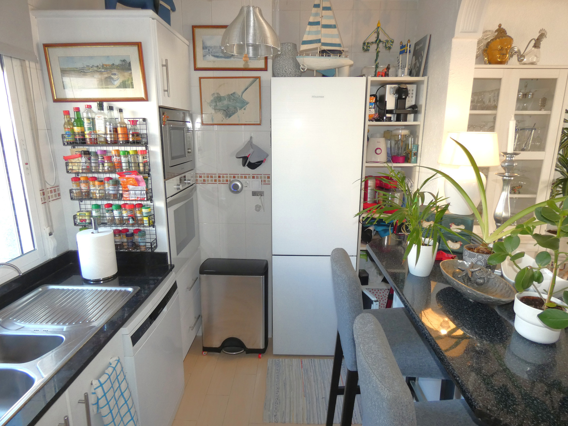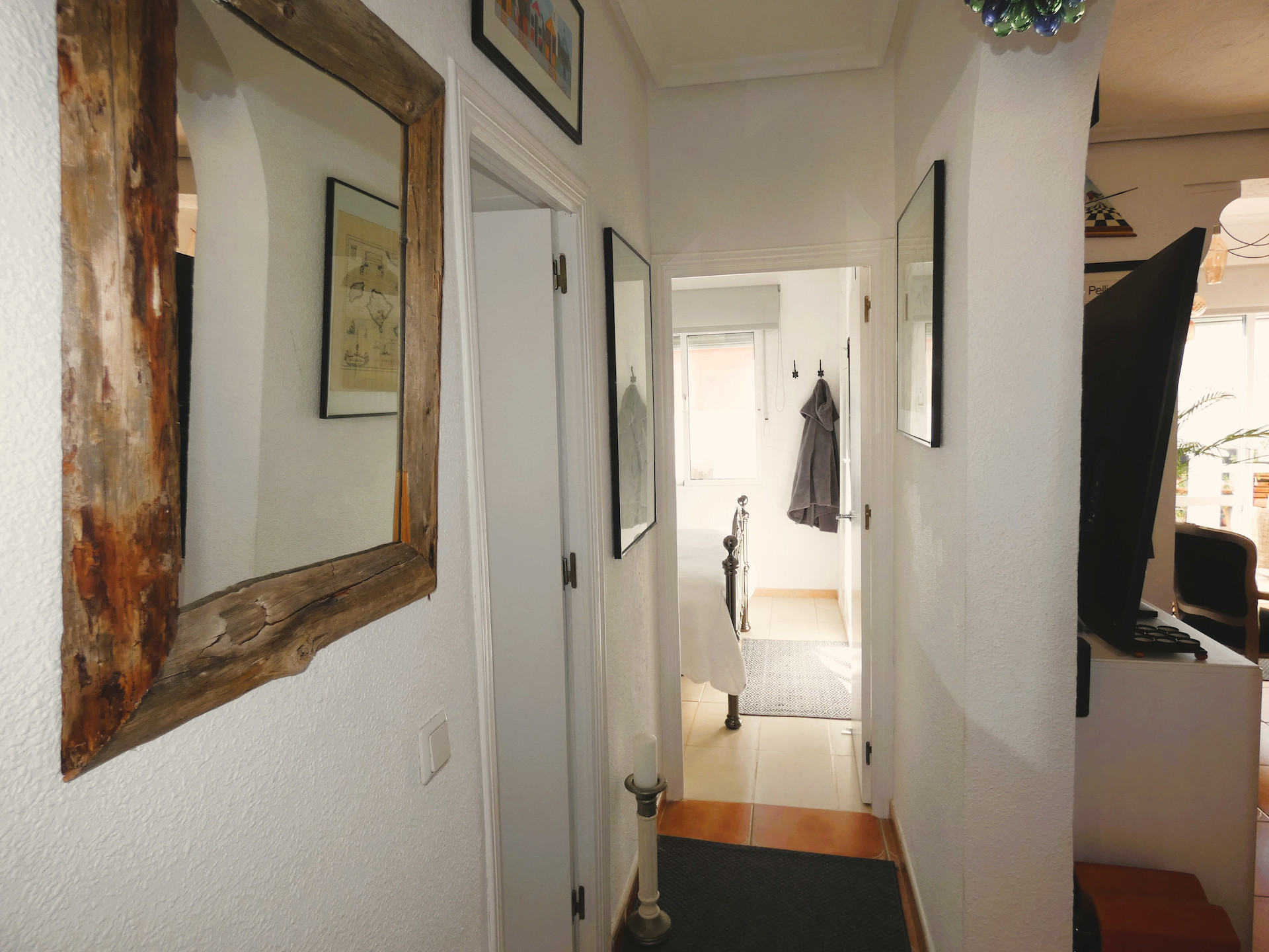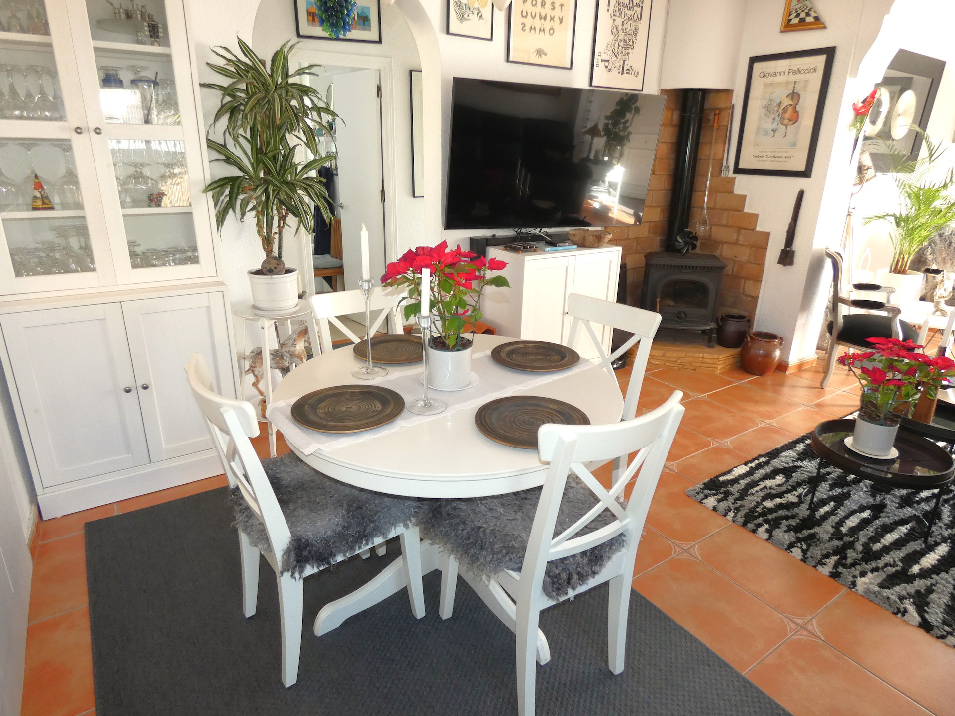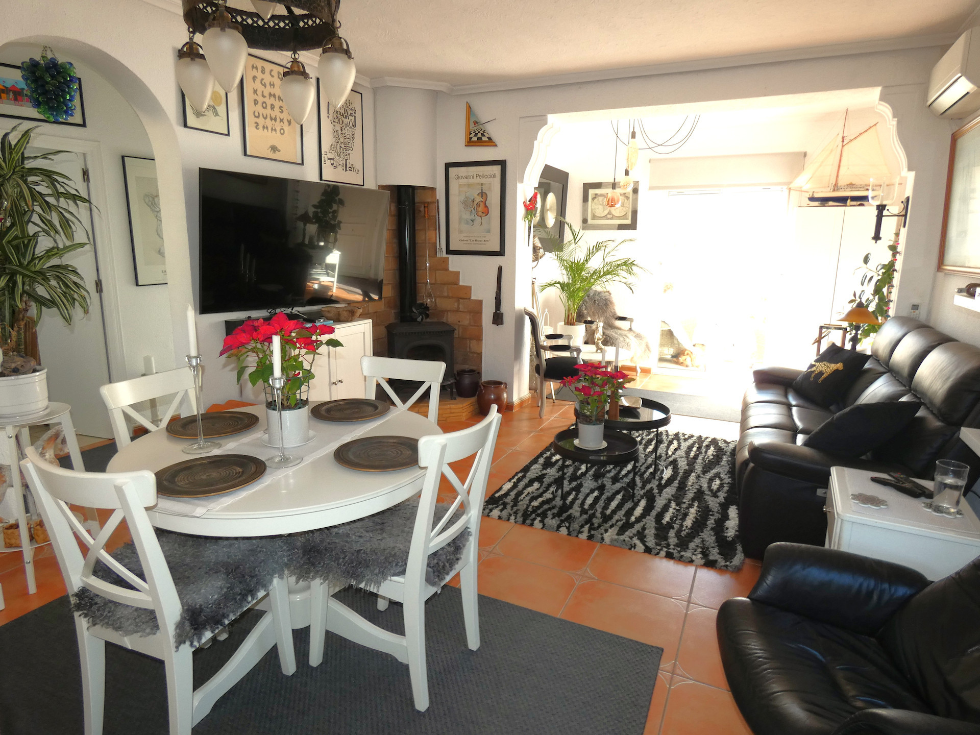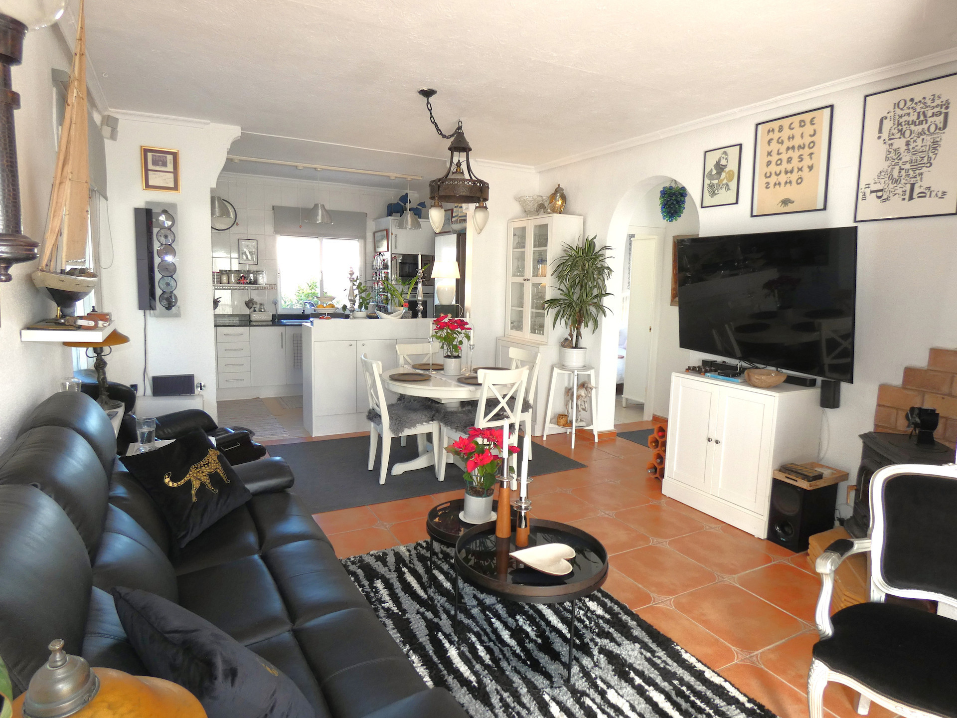 Inne i huset finns två sovrum och två badrum med dusch. Vardagsrummet går ihop med matrummet och har en öppen planlösning med köket. I vardagsrummet finns en kamin som man kan elda med ved eller pellets. Det ger en mycket mysig värme under vintern. Glasdörrar mot verandan ger mycket ljus och där kommer man direkt ut till poolen.