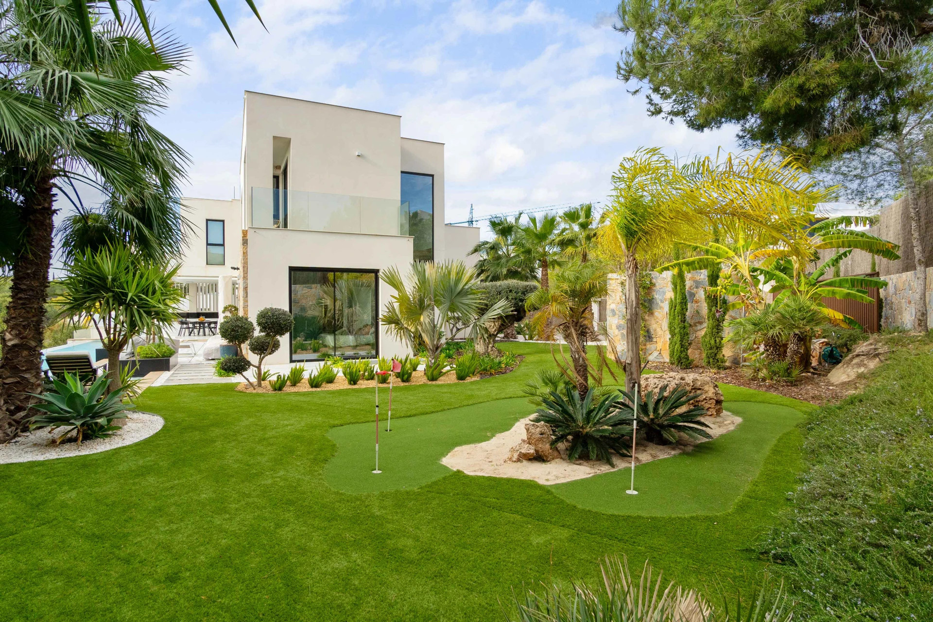 Vid inträdet i bostaden markerar en imponerande japansk inomhusträdgård med Ficus-träd husets rofyllda karaktär och leder in i ett vardagsrum/matsal med öppen planlösning som översvämmas av naturligt ljus. Huvudköket, i avantgardistisk design och utrustat med förstklassiga vitvaror, kompletteras av ett sekundärt kök som underlättar service och organisation. Från denna våning kommer man ut på en rymlig utomhusterrass med ett elegant utekök, sitt- och matplatser, samt en 16 × 3 meter infinitypool som harmoniskt smälter in i landskapet. Den utomhusbrasan och det privata golfövningsområdet ger en distinkt touch till detta utrymme som är utformat för avkoppling och underhållning. Denna våning rymmer också ett sovrum med eget badrum och direkt tillgång till trädgården, perfekt för gäster eller för de som önskar ett utrymme på bottenvåningen.