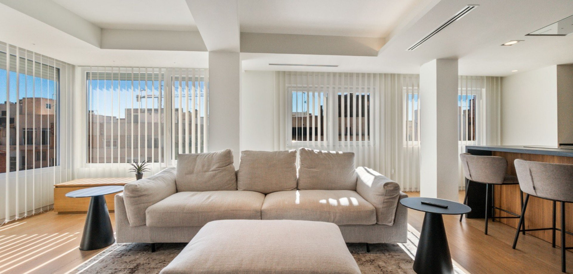Denna exceptionella takvåning upptar hela byggnadens översta våning och är resultatet av två lägenheter som kombinerats till ett rymligt hem på cirka 160 m². Fastigheten är helt renoverad med förstklassiga material och ytbehandlingar och erbjuder en sällsynt blandning av rymd, kvalitet och ett utmärkt läge i centrala Torrevieja.